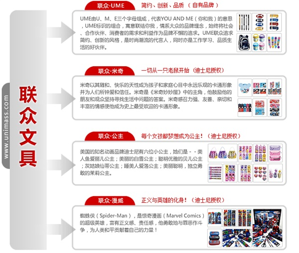 廣東聯(lián)眾文具有限公司由現(xiàn)任總裁施紅光先生創(chuàng)辦于1996年。自成立以來,聯(lián)眾公司一直專注于學(xué)生、辦公文具及新潮禮品的開發(fā)、設(shè)計、制造和銷售。目前,聯(lián)眾公司產(chǎn)品線涵蓋日常事務(wù)型文具、書寫工具、彩繪工具、精美套裝禮品、筆袋、筆盒、書包、水壺水杯、毛絨公仔等品類;品牌包括聯(lián)眾UME 系列、聯(lián)眾出奇蛋系列及迪士尼國際授權(quán)品牌系列。國內(nèi)營銷網(wǎng)絡(luò)已覆蓋國內(nèi)30個省市,并在北京、廣州、上海、南京、武漢、成都、西安、沈陽等八大城市設(shè)立了輻射全國的區(qū)域服務(wù)平臺。