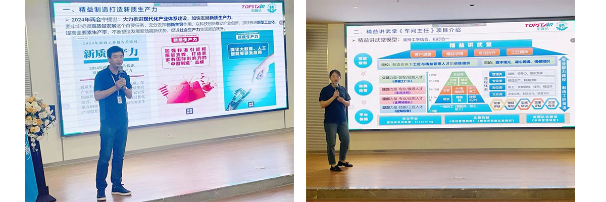 開營典禮上,拓斯達副總裁姜總表示,制造是公司最穩(wěn)固的根基,企業(yè)長久經(jīng)營一定要以品質優(yōu)先,任何的降本都不能以犧牲品質為代價。同時分享組織改善“5到”模型: