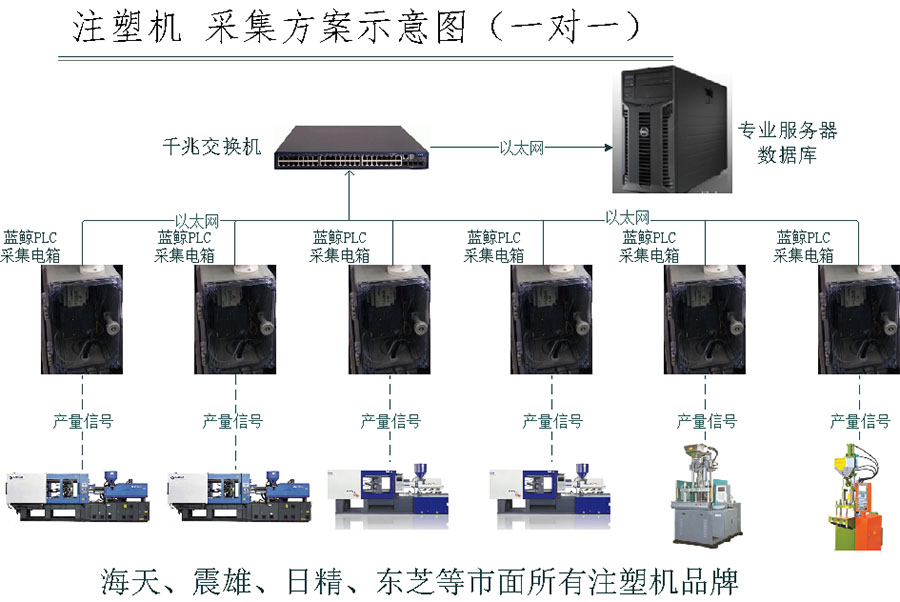車間所有的注塑機(jī)全部直取數(shù)字、模擬信號(hào)、支持PLC取信號(hào)、支持OPC、無須附加