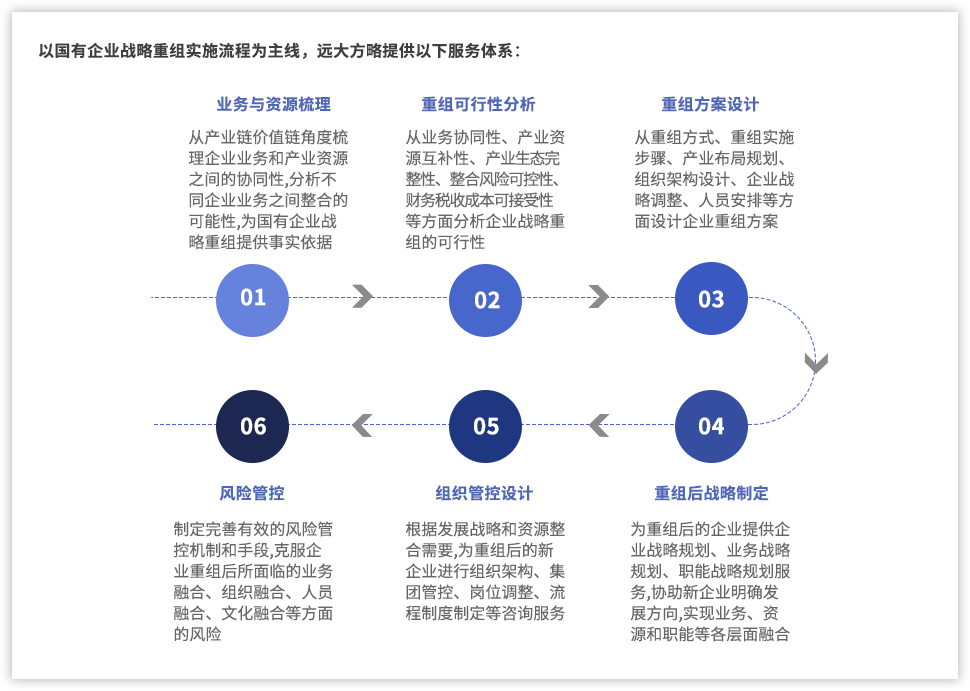 以國有企業(yè)戰(zhàn)略重組實施流程為主線,遠大方略提供以下服務(wù)體系: