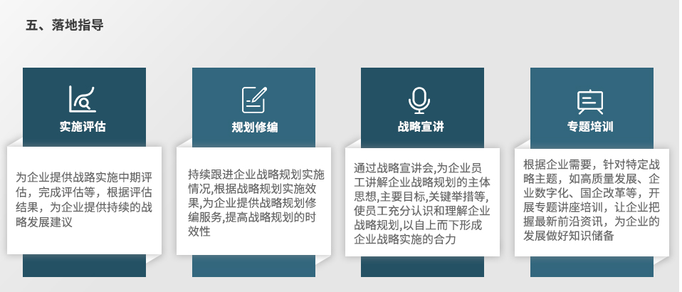 面臨未來更為復雜的發(fā)展環(huán)境,遠大方略將從環(huán)境分析、戰(zhàn)略選擇、策略制定、落實保障、落地指導等方面幫助客戶形成完整的戰(zhàn)略管理體系并推動落地實施。