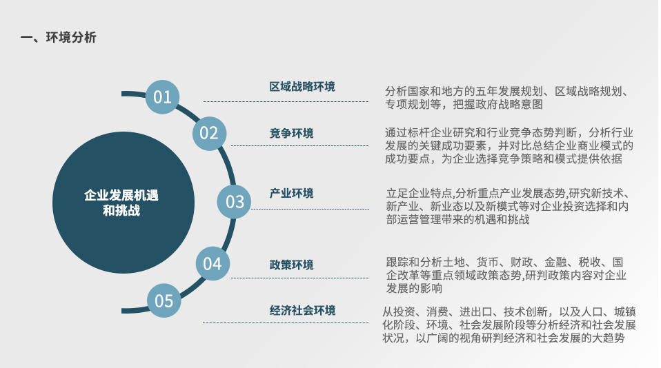 面對全球經(jīng)濟不確定性的加劇與人口紅利的消退,中國經(jīng)濟增長將從要素驅(qū)動與投資驅(qū)動,轉(zhuǎn)向創(chuàng)新驅(qū)動。為了應對未來我國經(jīng)濟和社會發(fā)展的變化,尋求新的發(fā)展機遇,在市場競爭中占據(jù)優(yōu)勢,企業(yè)需要準確研判區(qū)域戰(zhàn)略環(huán)境、政策環(huán)境、經(jīng)濟社會環(huán)境、產(chǎn)業(yè)環(huán)境、競爭環(huán)境等,根據(jù)自身發(fā)展現(xiàn)狀,明確企業(yè)愿景、戰(zhàn)略導向、發(fā)展目標和業(yè)務布局方向,從商業(yè)模式、競爭策略、投資方向、資源獲取等方面規(guī)劃發(fā)展戰(zhàn)略,并為戰(zhàn)略落實構(gòu)建合理的戰(zhàn)略保障體系。
