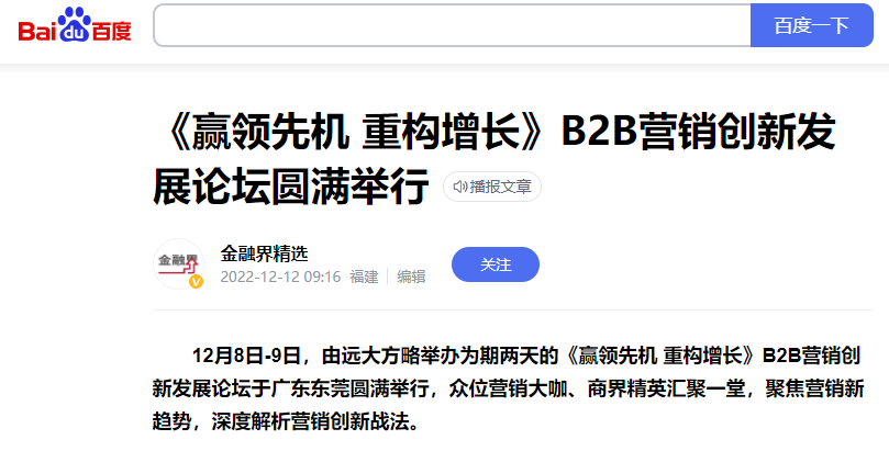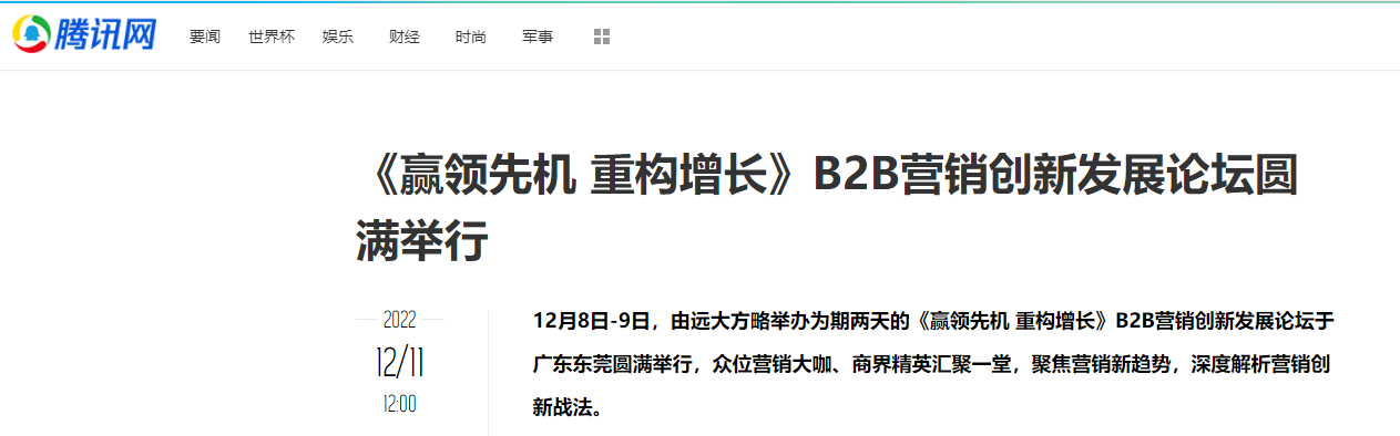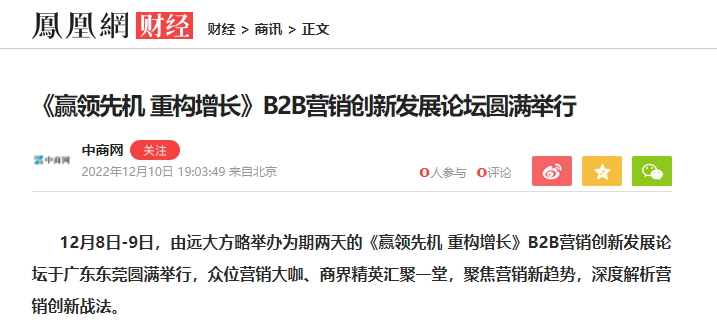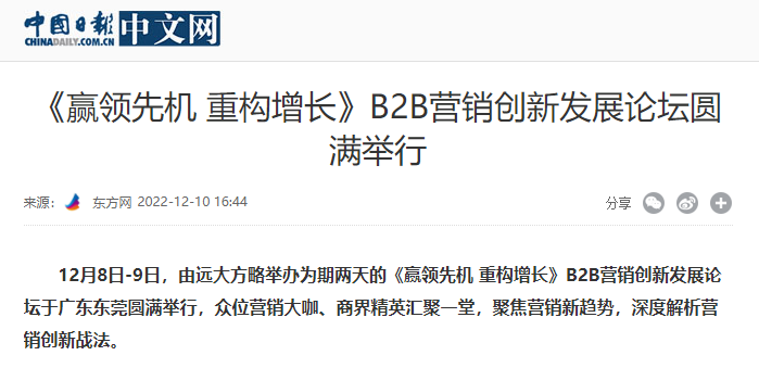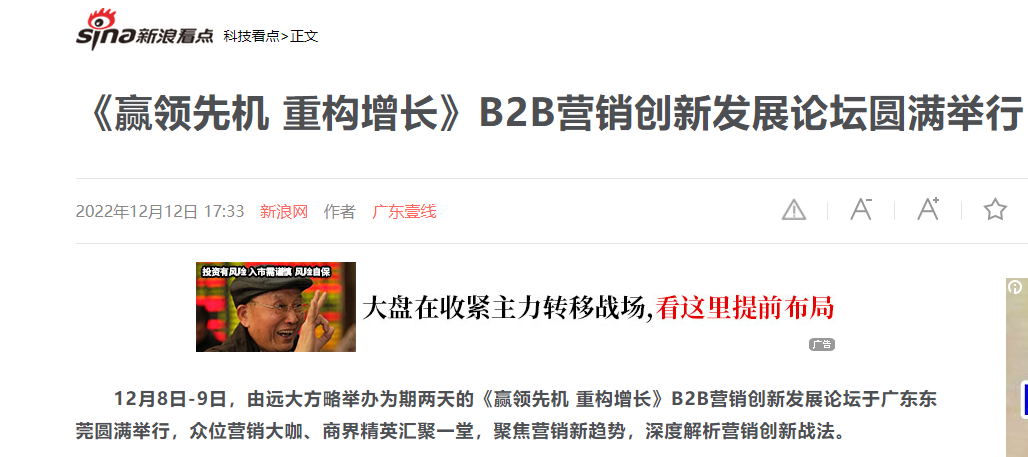 12月8日-9日,由遠(yuǎn)大方略舉辦為期兩天的《贏領(lǐng)先機(jī) 重構(gòu)增長(zhǎng)》B2B營(yíng)銷(xiāo)創(chuàng)新發(fā)展論壇于廣東東莞圓滿(mǎn)舉行,眾位營(yíng)銷(xiāo)大咖、商界精英匯聚一堂,聚焦?fàn)I銷(xiāo)新趨勢(shì),深度解析營(yíng)銷(xiāo)創(chuàng)新戰(zhàn)法。