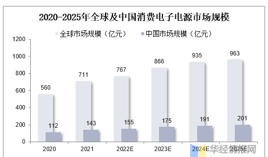 消費電子電源主要包括用于給手機,智能穿戴設(shè)備,智能家居等智能終端產(chǎn)品充電的電源,未來將隨下游產(chǎn)品更新?lián)Q代周期縮短以及新型應(yīng)用領(lǐng)域不斷出現(xiàn)而穩(wěn)定增長。從消費電子電源市場來看,預(yù)計至2025年全球消費電子電源市場規(guī)模將達962.67億元,2020-2025年CAGR達11.44%,其中手機電源,PC及PAD電源,智能可穿戴電源,智能家居電源市場規(guī)模分別達440億元,246億元,80億元,196億元;至2025年中國消費電子電源市場規(guī)模將達201億元,2020~2025年CAGR達12.35%,其中手機電源,PC及PAD電源,智能可穿戴電源,智能家居電源市場規(guī)模分別達86億元,41億元,22億元,52億元。
