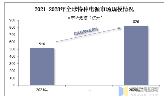特種電源是指具有不同于普通電源的特殊指標(如高壓輸出、特大電流輸出、脈沖輸出等)和特殊用途的電源裝置。據(jù)NT Cysd數(shù)據(jù),2021年全球軍用電源市場規(guī)模大約為516億元,預(yù)計2028年將達到826億元,2022-2028期間年復(fù)合增長率為6.8%。