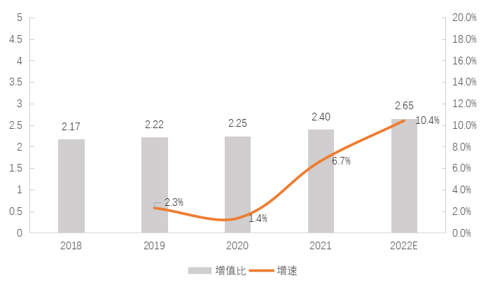 食材加工市場規(guī)模達(dá)到10.5萬億元,主要類別有:肉類、蛋類、奶及奶制品、蔬菜類、水果、水產(chǎn)品、谷物等,綜合加工增值比為2.4:1,相比十三五初期(2016年)的產(chǎn)值增值比2.1:1有著重大突破,如圖3-4,3-5所示?;诖粟厔?,2022年食材加工市場增值比增速將突破2位數(shù),然而因受到疫情影響,能否成功突破2位數(shù)有諸多不確定因素。