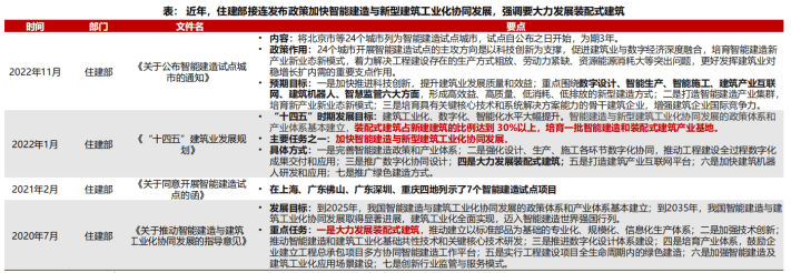 從國家政策上看,2020年7月發(fā)布了《關(guān)于推動智能建造與建筑工業(yè)化協(xié)同發(fā)展的指導(dǎo)意見》;2021年2月發(fā)布了《關(guān)于同意開展智能建造試點的函》;2022年1月發(fā)布了《“十四五”建筑業(yè)發(fā)展規(guī)劃》;2022年11月發(fā)布了《關(guān)于公布智能建造試點城市的通知》。住建部正在穩(wěn)步推進智能建造,“十四五”建筑業(yè)發(fā)展規(guī)劃提出要求裝配式建筑占新建建筑的比例達到 30%以上,培育一批智能建造和裝配式建筑產(chǎn)業(yè)基地,裝配式建筑將成為主要的發(fā)力點。在“雙碳”的背景之下,建筑行業(yè)作為“碳排放大戶”,“碳達峰”任務(wù)的主要抓手,擁有碳減排的空間極大,將會成為節(jié)能減排的重要節(jié)點。