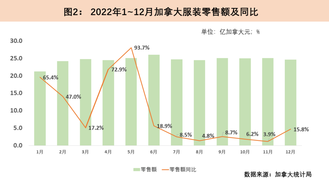 2022年加拿大同樣飽受高通脹的困擾,年度平均通脹率達6.8%,較上年翻了一番,但整體好于美國。2022年1至5月加拿大服裝零售在上一年低基數(shù)效應的影響下大幅增長,5月服裝零售額同比增幅達93.7%。隨著2022年6月加拿大通脹率攀升至8.1%的最高點,同時低基數(shù)效應減弱,加拿大服裝零售在下半年增速驟降至個位數(shù)。2022年12月,加拿大服裝零售迎來一波小回升,當月服裝零售額達24.7億加元(約18.1億美元),同比增長15.8%。