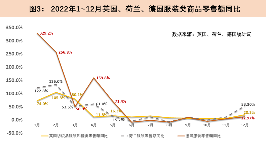 2022年荷蘭服裝零售基本遵循同年英國的變動軌跡。在前四個月服裝零售平均同比增速達到93.1%后,荷蘭服裝零售增速驟減,甚至在6月和8月陷入負增長;12月則同比大漲53.3%,全年服裝零售累計增長24%。2022年德國前五個月服裝零售的平均增速在上年低基數(shù)效應的影響下同比大漲173.6%,隨后在德國通脹一路走高的背景下逐漸下行,2022全年德國服裝零售同比增長30.7%。