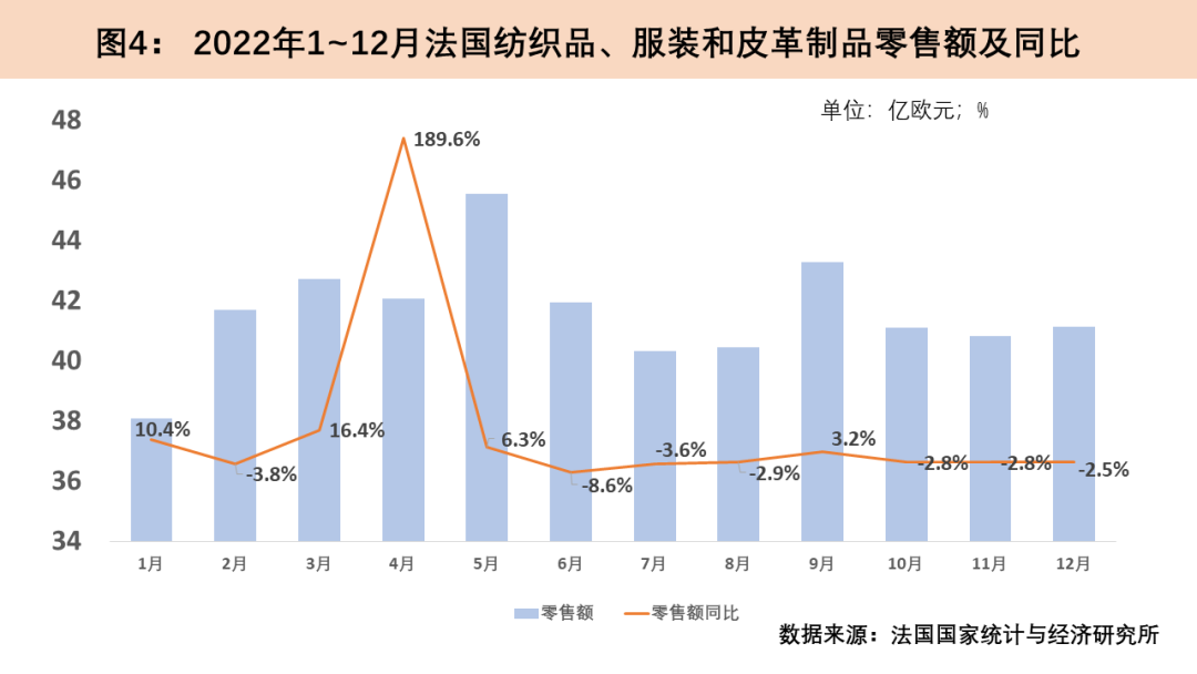 法國GDP在2020年經(jīng)歷急劇下滑后,于2021年第三季度在政府經(jīng)濟刺激舉措的作用下實現(xiàn)了顯著反彈,恢復至疫情前水平。2022年下半年以來,法國家庭消費受通脹抑制,經(jīng)濟增長呈下降態(tài)勢,2022年全年經(jīng)濟增速僅為2.6%。2022年法國紡織品服裝類商品零售在經(jīng)歷了4月的一波高速增長后下半年同比增速持續(xù)為負,全年紡織品、服裝和皮革制品零售額達492.5億歐元(約529.8億美元),同比增長4.5%。