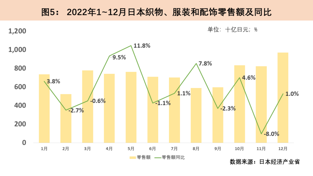 2022年日本紡織品服裝零售額受疫情反復而波動。2022年初日本受到奧密克戎病毒的沖擊,2月紡織品服裝零售環(huán)比驟降29.3%,同比下滑2.7%。2022年3月日本全面解除疫情管控措施,紡織品服裝零售額于4月增速由負轉正,5月同比增速達11.8%。2022年7至9月日本迎來第二輪疫情高峰,7月以來日本紡織品服裝零售額連續(xù)三月下降。10月,日本解除入境限制并對國內旅游發(fā)放補貼,經(jīng)濟刺激政策下服裝消費開始穩(wěn)步回升,12月日本紡織品服裝零售額環(huán)比上漲18.5%。