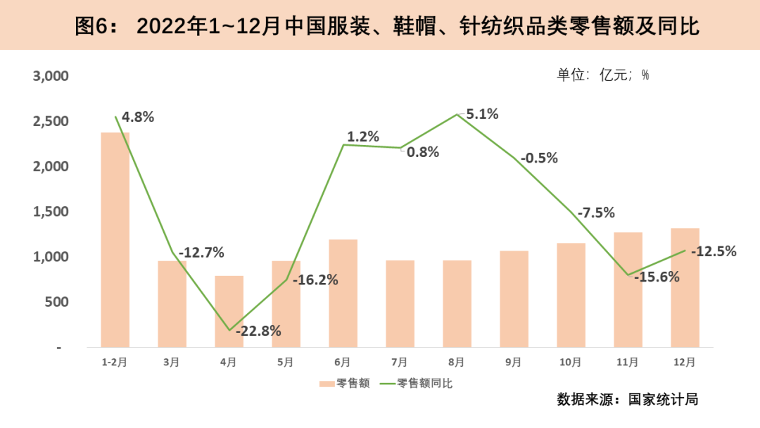 2022年,我國經(jīng)歷多輪疫情反復沖擊,尤其是3月和11月兩波疫情的大面積反撲導致我國紡織品服裝零售內需承壓,內銷市場明顯下滑,全年紡織品服裝零售額呈現(xiàn)波動下行趨勢。2022年3月國內疫情呈現(xiàn)多點散發(fā),紡織品服裝產(chǎn)品銷售場景受限,3至5月零售下降明顯。隨著疫情得到有效控制,6至8月紡織品服裝零售同比增速由負轉正。11月疫情形勢再度嚴峻,我國紡織品服裝零售額快速下降,最高降幅在當月達到15.6%。根據(jù)統(tǒng)計局數(shù)據(jù),2022年全國限額以上服裝、鞋帽、針紡織品類商品零售額共計13003億元人民幣,同比減少6.5%。