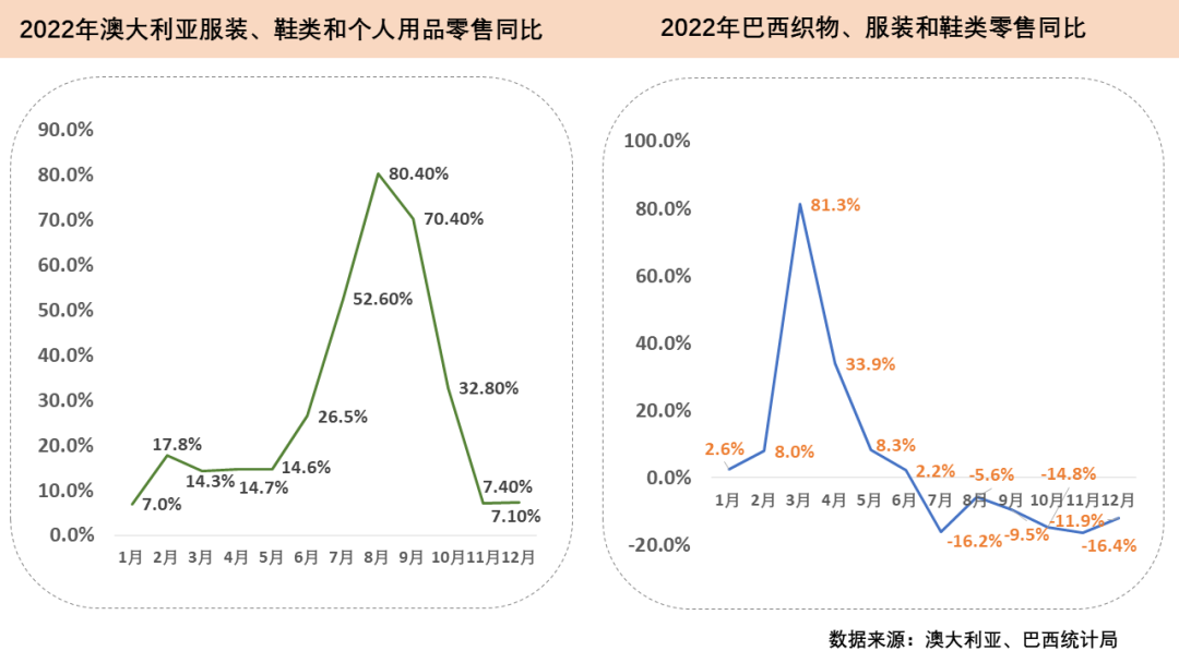 2022年澳大利亞CPI全年上漲7.8%,創(chuàng)1990年以來最大年度漲幅。同年,澳大利亞服裝類商品零售額整體表現(xiàn)相對平穩(wěn),7至9月在上一年低基數(shù)效應的影響下實現(xiàn)兩位數(shù)的大幅增長。2022年全年澳大利亞服裝、鞋類和個人用品零售額達347.2億澳元(約232.2億美元),同比增長25.4%。