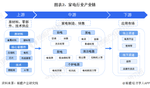 家電產(chǎn)品的生產(chǎn)需要使用金屬、塑料等原材料和各類電子元器件、壓縮機(jī)、電機(jī)、芯片等零部件,按照產(chǎn)品設(shè)計方案和一定的工作流程對上述原材料和零配件進(jìn)行加工、組裝,產(chǎn)出產(chǎn)品后通過一定的銷售渠道銷售給客戶。隨著智能家電的發(fā)展,家電行業(yè)對于上游物聯(lián)網(wǎng)、人工智能等技術(shù)需求也在增長,新技術(shù)正在塑造新的家電產(chǎn)業(yè)鏈。