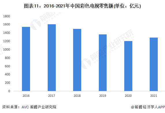 從彩電的零售額看,2016-2021年呈現(xiàn)波動下降趨勢,2017年達(dá)到最高值為1609億元,2018年以來一路下降,2021年彩電零售額為1289億元,較2020年增長6.6%。