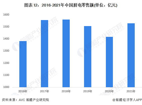 2016-2021年中國廚電零售額波動變化,其中2018年達(dá)到最近4年最高值為1559億元,2019年起有所下降,2021年達(dá)到1528億元,較2020年增長約7.9%。