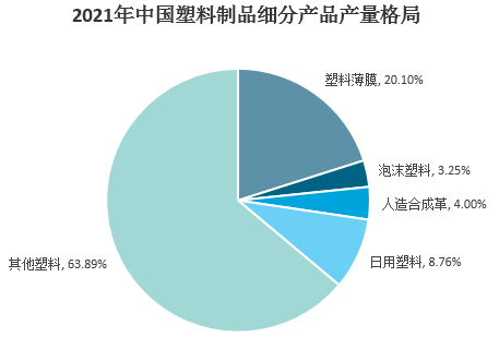 國內(nèi)塑料制品產(chǎn)品門類眾多,從細分市場來看,2021年我國塑料薄膜產(chǎn)量1608.71萬噸,占比20.1%;日用塑料產(chǎn)量701.53萬噸,占比8.76%;人造合成革產(chǎn)量320.16萬噸,占比4%;泡沫塑料產(chǎn)量260.09萬噸,占比3.25%;其它塑料產(chǎn)量5113.49萬噸,占63.89%。