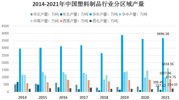 從生產(chǎn)的區(qū)域分布來看,國內(nèi)塑料制品生產(chǎn)集中在華東、華南、華中地區(qū)。2021年,華東地區(qū)塑料制品產(chǎn)量3696.28萬噸,占全國的比重為46.18%。華南地區(qū)發(fā)展迅速,塑料制品產(chǎn)量1634.36萬噸,占比20.42%。華中地區(qū)塑料制品產(chǎn)量1007.66萬噸,占比12.59%。其他地區(qū)塑料制品產(chǎn)量均在千萬噸以下,其他地區(qū)合計占比20.81%。