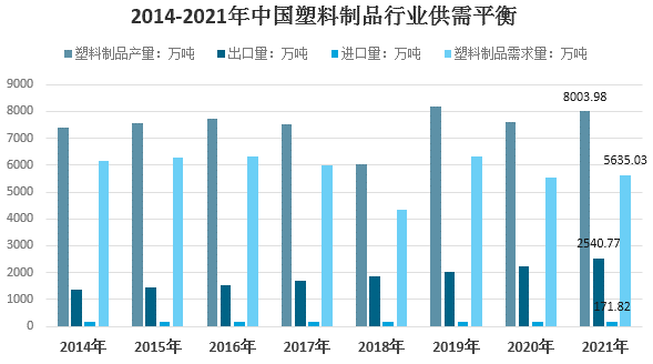 根據(jù)海關(guān)數(shù)據(jù),2021年我國塑料制品行業(yè)進口171.82萬噸,出口2540.77萬噸,結(jié)合國內(nèi)產(chǎn)量來看,2021年我國塑料制品行業(yè)表觀需求量達到5635.03萬噸。