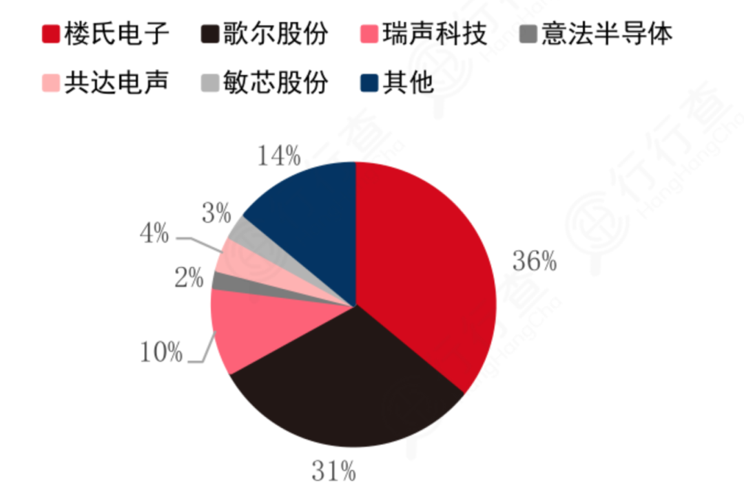 樓氏電子市場份額達36%,歌爾股份、瑞聲科技、共達電聲、敏芯股份市場規(guī)模分別達到31%/10%/4%/3%,合計占據(jù)48%。