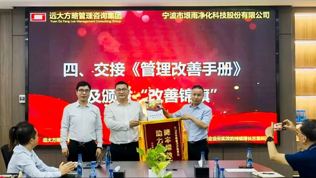 會(huì)上,遠(yuǎn)大方略項(xiàng)目組與垠雨科技交接了《管理改善手冊(cè)》,林董向遠(yuǎn)大方略授予了錦旗以表認(rèn)可。