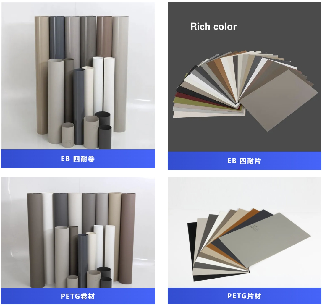 公司產(chǎn)品主要包括PETG膚啞卷材/片材、高光卷材/片材、EB 卷材/片材以及配套全系同色封邊條,產(chǎn)品性能表現(xiàn)出色,顏色穩(wěn)定、高硬度、超耐磨、防劃花、抗指紋、熱修復、耐干熱、耐污染、耐灼燒、耐黃變。