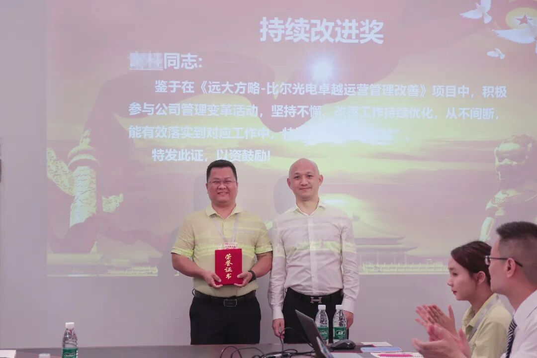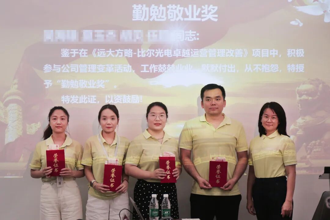 在一期改善過(guò)程中,對(duì)于表現(xiàn)優(yōu)秀的個(gè)人,也給予了表彰,比爾光電領(lǐng)導(dǎo)為表現(xiàn)突出的同事頒發(fā)了榮譽(yù)證書(shū)。