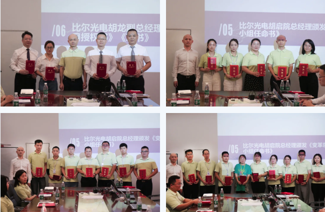 為促進(jìn)項(xiàng)目的有效落地,明確各崗位職責(zé),強(qiáng)化責(zé)任意識(shí),會(huì)上比爾光電領(lǐng)導(dǎo)為遠(yuǎn)大方略項(xiàng)目組頒發(fā)了授權(quán)書(shū),為老師和變革小組的核心成員頒發(fā)了聘書(shū)。